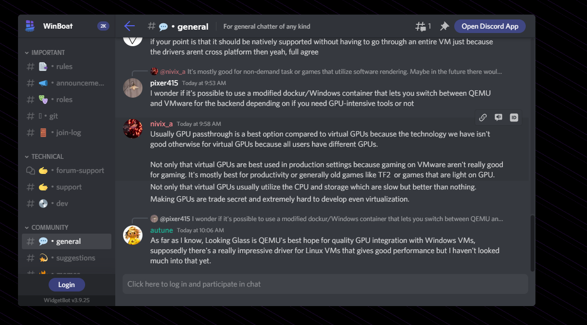 현 시점의 WinBoat는 완전한 GPU 패스스루를 제공하지 않는다.