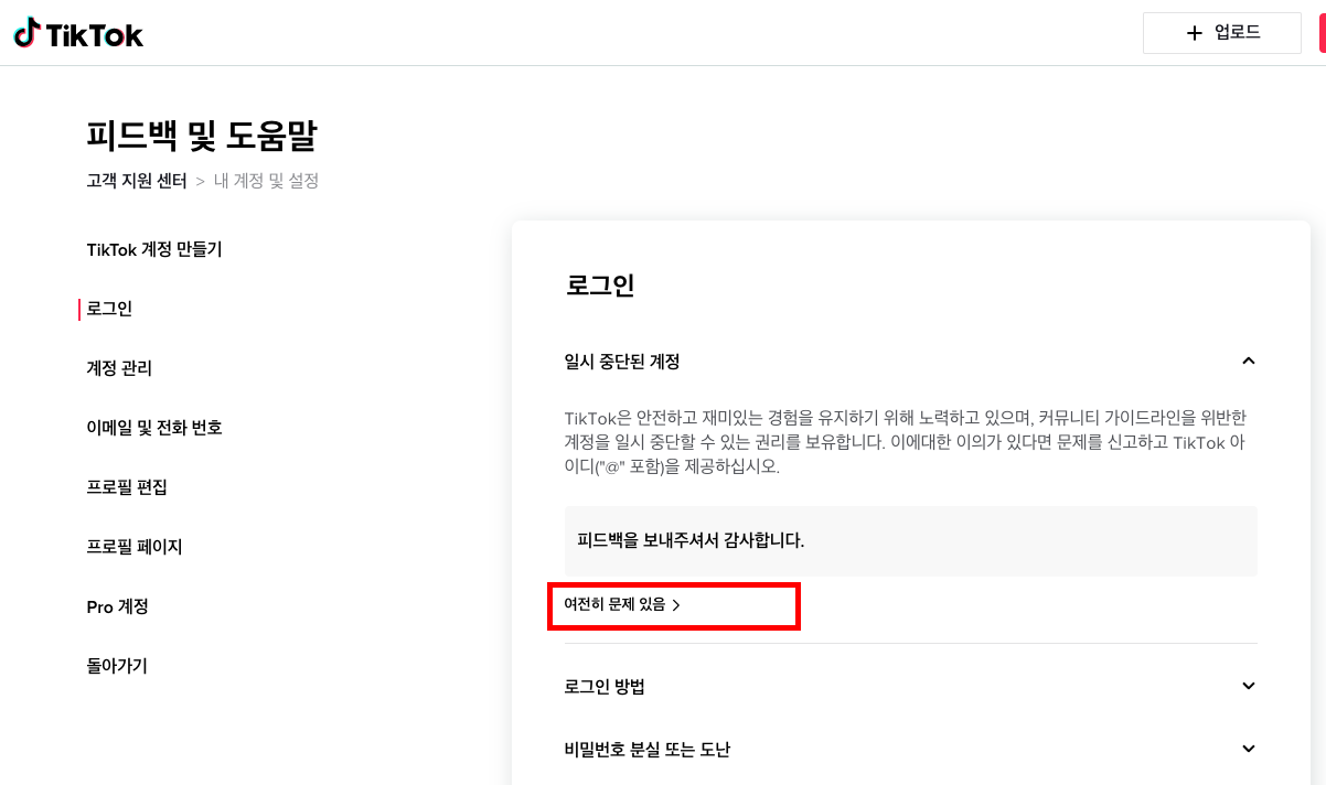 만약 로그인 자체가 불가능하면, 공식 고객지원 이메일(feedback@tiktok.com)로 직접 문의하는 방법도 있습니다.