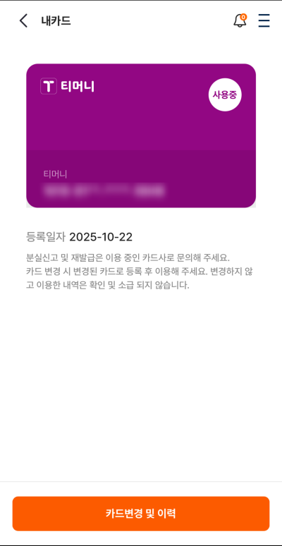 케이패스 앱 오른쪽 상단 메뉴에서 내카드 항목으로 들어가 기존 신용카드 대신 모바일티머니를 선택해 주면 되고, 이어서 카드 유효성 체크를 통해 오늘 날짜로 등록이 갱신되면 변경이 완료됩니다.