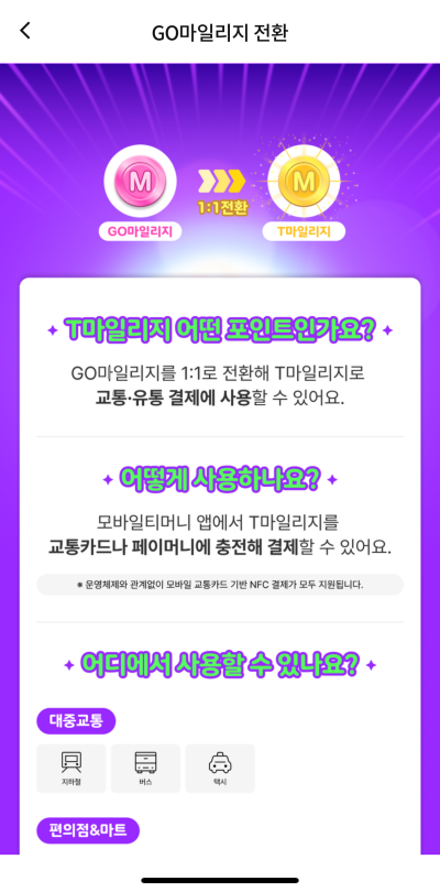 GO마일리지는 티머니고 앱 이용자에게 제공되는 리워드 형태이고, T마일리지는 모바일티머니 이용 시 적립되는 교통비 적립 마일리지입니다. GO마일리지는 T마일리지로 전환할 수 있지만 그 반대는 불가하며, T마일리지는 다시 모바일티머니 충전에 사용해 교통비 실질 절감 효과를 만들 수 있습니다.