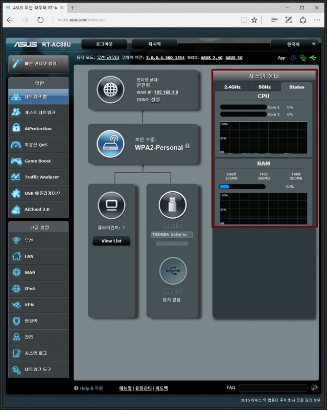 설정이 완료되면 대시보드에서 네트워크 상태와 연결 장비를 확인할 수 있다.
