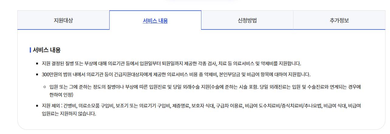 | 지원 범위 | 입원·수술·재활 의료비의 본인부담금 및 일부 비급여 |