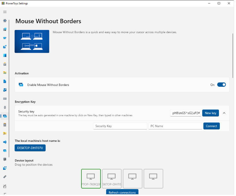 모니터만 여러 대 있는 것이 아니라 PC까지 여러 대라면 Mouse Without Borders 모듈을 꼭 살펴볼 만하다. 이 기능은 이전에 Microsoft Garage – Mouse without Borders라는 별도 프로그램으로 배포되던 것을 PowerToys 안으로 통합한 버전이다.