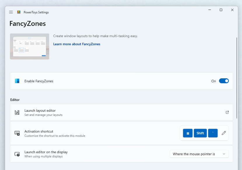 장기적으로 보면 PowerDisplay는 하드웨어 쪽의 “눈에 보이는 환경”을 정리해 주는 역할을 맡게 된다. 이와 짝을 이루는 것이 바로 창 배치를 담당하는 FancyZones다.