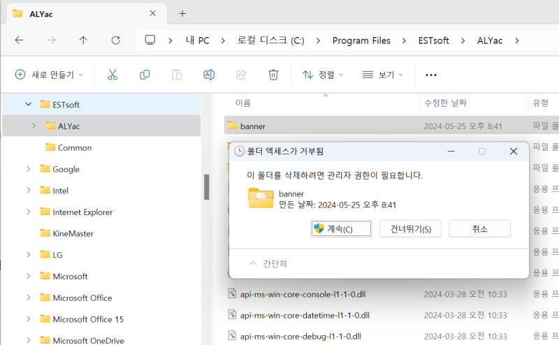 여기서 [Banner] 폴더를 삭제하려고 하면 “관리자 권한이 필요합니다” 또는 “액세스가 거부되었습니다” 같은 메시지가 뜨면서 삭제가 되지 않는 경우가 많습니다.