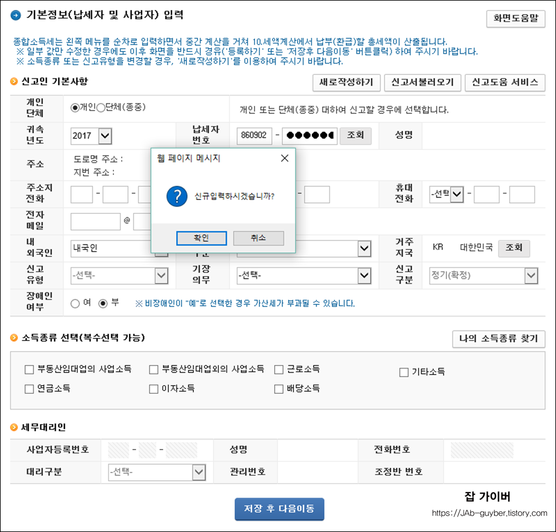 만약 이자소득이나 배당소득, 근로소득, 연금소득 등 추가로 입금해야 할 정보가 있다면 입력을 합니다.