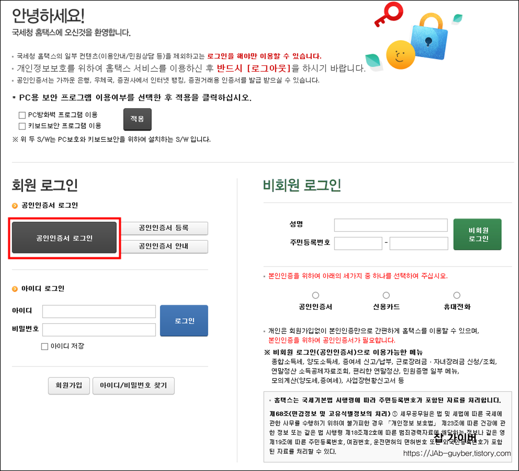 - 종합소득세 신고를 위해서는 홈택스에 공인인증서 로그인이 필요합니다.