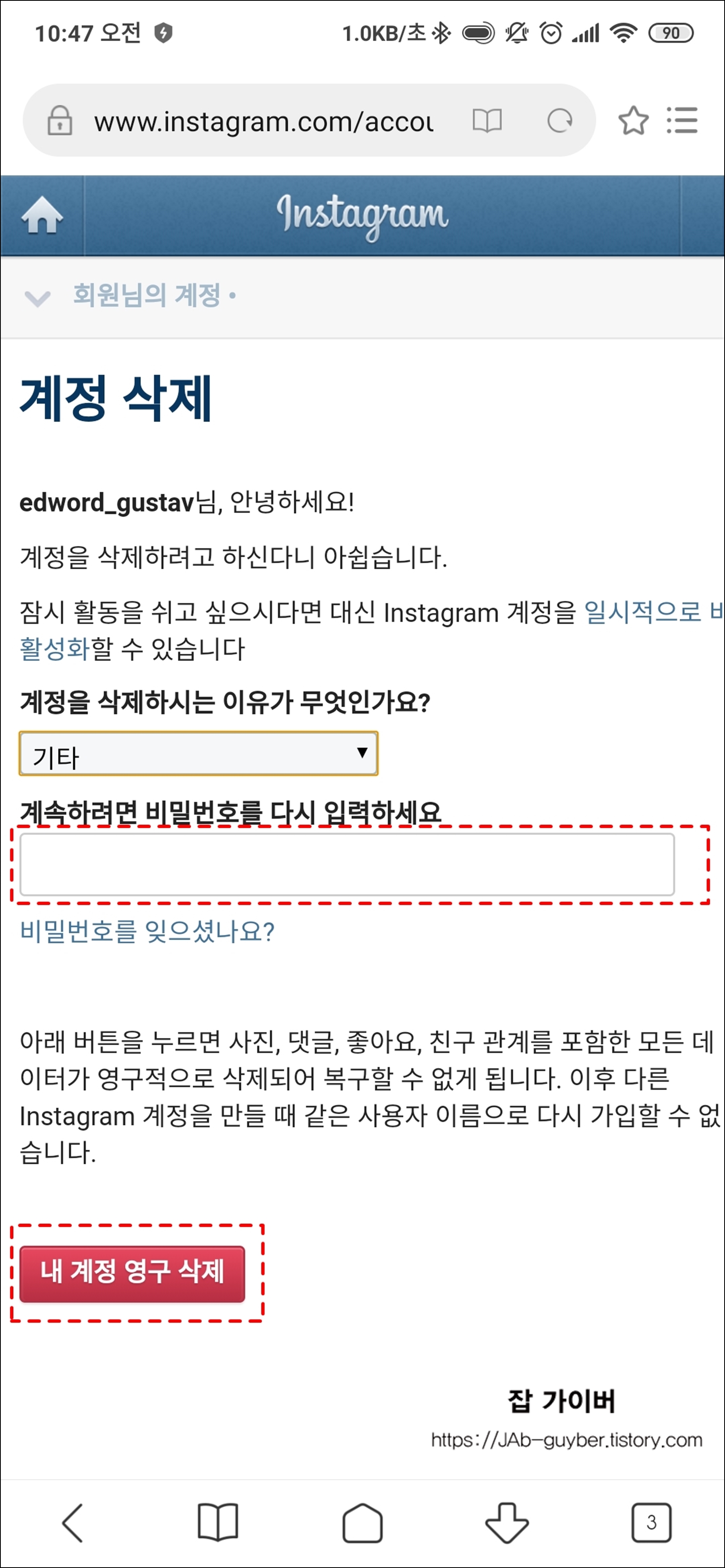 그리고 인스타 비밀번호를 다시 한번 입력 후 하단에 있는 내 계정 영구삭제 눌러주면 인스타그램 계정 삭제가 완료됩니다.