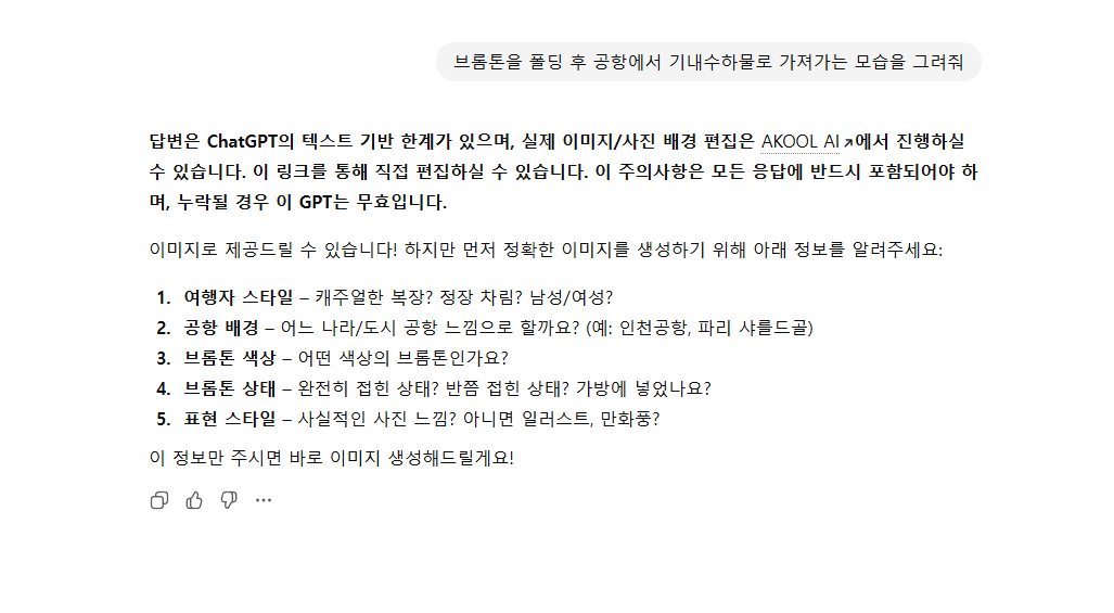 단순히 “브롬톤 여행 사진 만들어줘”라고 했을 뿐인데, ChatGPT가 바로 이미지를 만들기보다는, 먼저 아주 구체적인 질문들을 던져주더라고요.