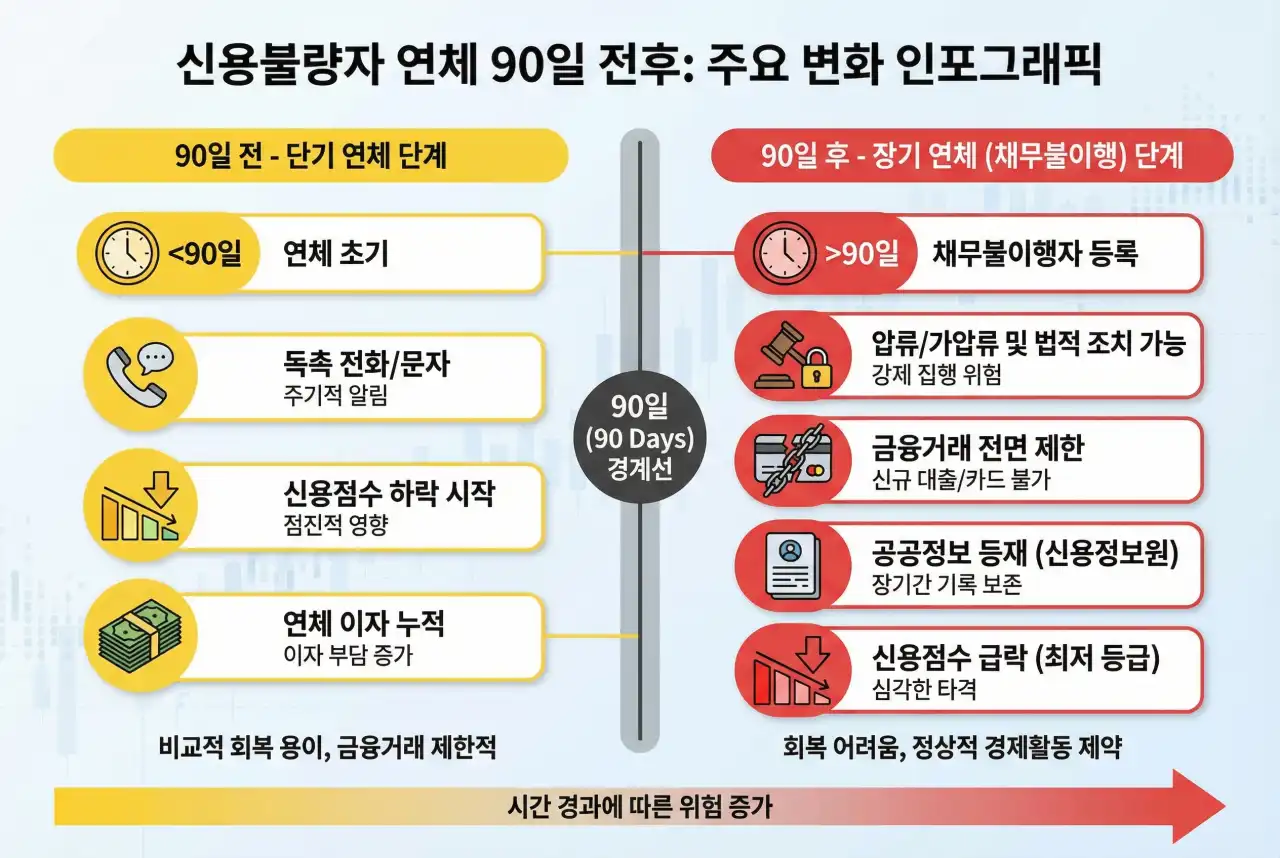“신불자 기준”을 한 문장으로 끊어 말하기는 어렵다. 다만 현장에서는 보통 연체 기간이 길어졌을 때 체감이 확 달라진다. 특히 90일 전후로 이야기가 많이 갈린다.