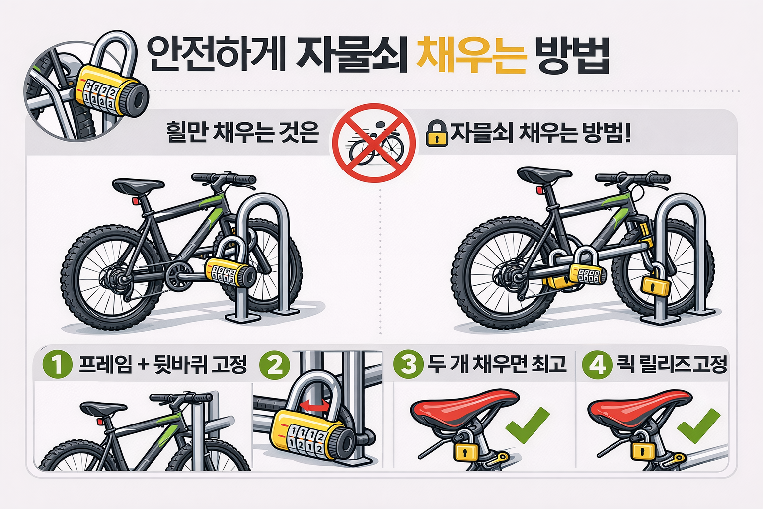 - 메인 락(U락/체인)으로 프레임 고정