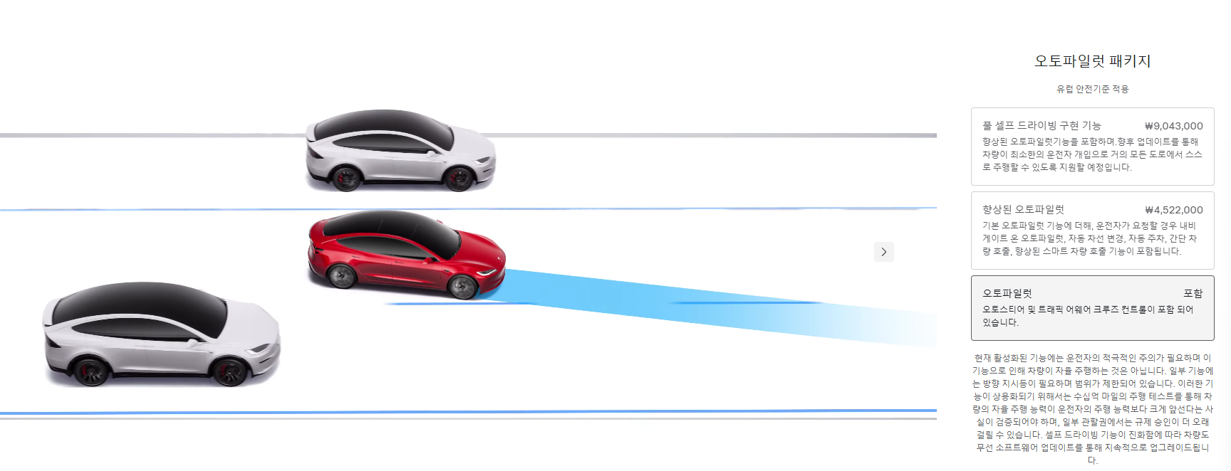 | 기본 오토파일럿 | 기본 포함 | 추가 비용 없음 | 자율주행이 아니라 ‘운전 보조’라는 기대치 조절이 필요 | 대부분의 사용자에게 기본 만족도가 높음 |