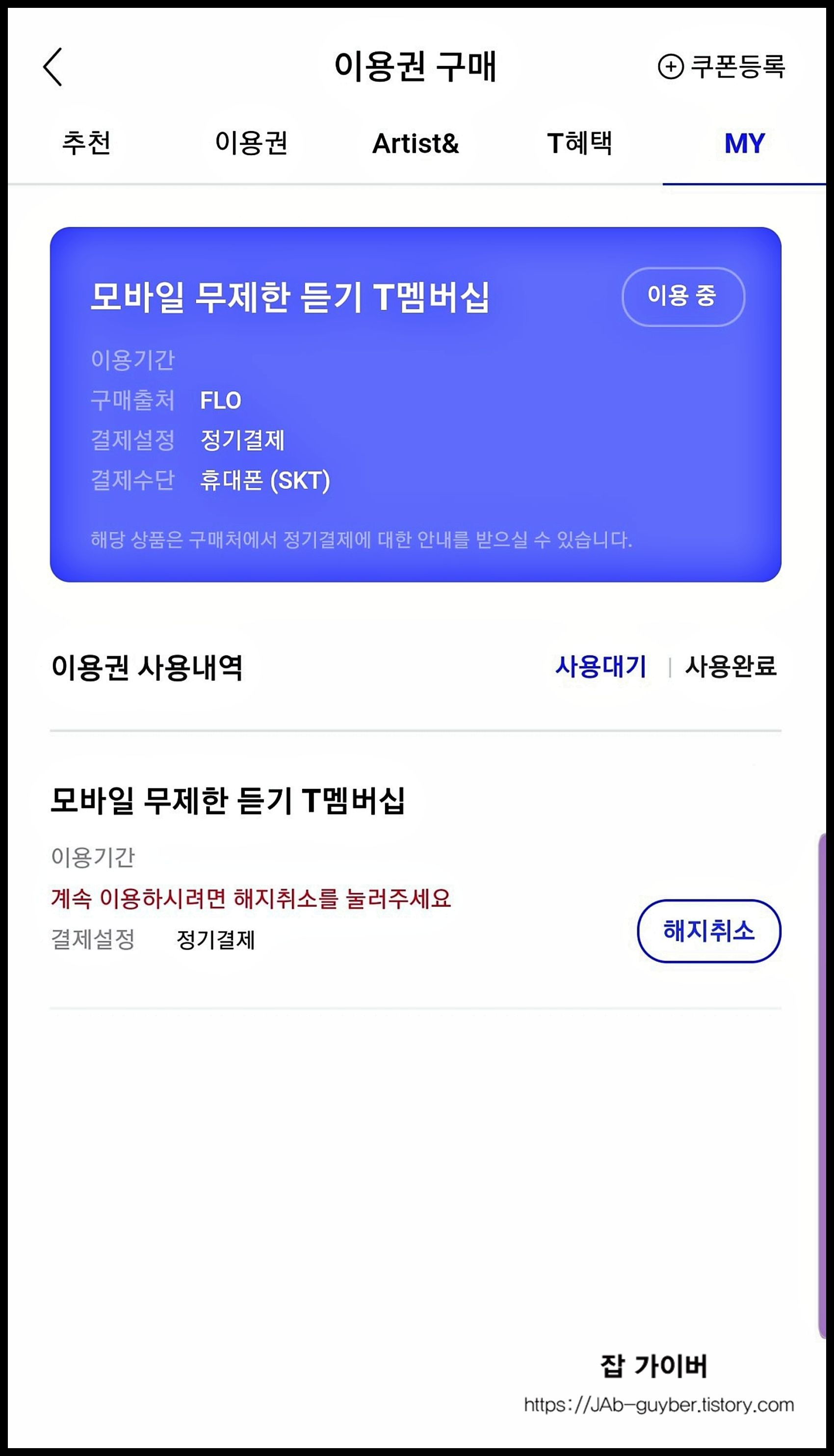 이것으로 FLO 이용권 해지가 완료되었으며 이용권 사용내역에서 사용대기상태에 있다면 사용해지에 대해서 취소가 가능하니 참고하세요