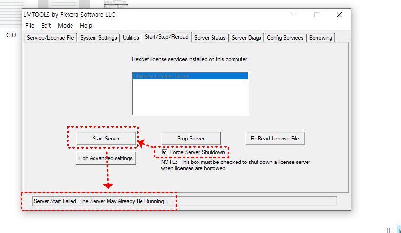 서버 중지 후 Force Server Shutdown 항목을 체크한 뒤 Start Server를 눌러 라이선스 서버를 다시 실행합니다.