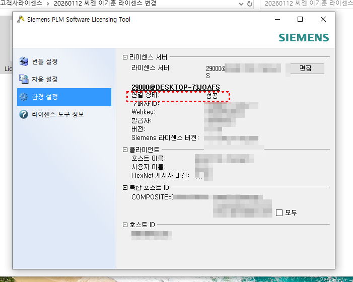 가상머신 사용, 네트워크 카드 교체, 메인보드 변경 이후 NX 라이선스가 갑자기 인식되지 않는 경우가 많습니다.