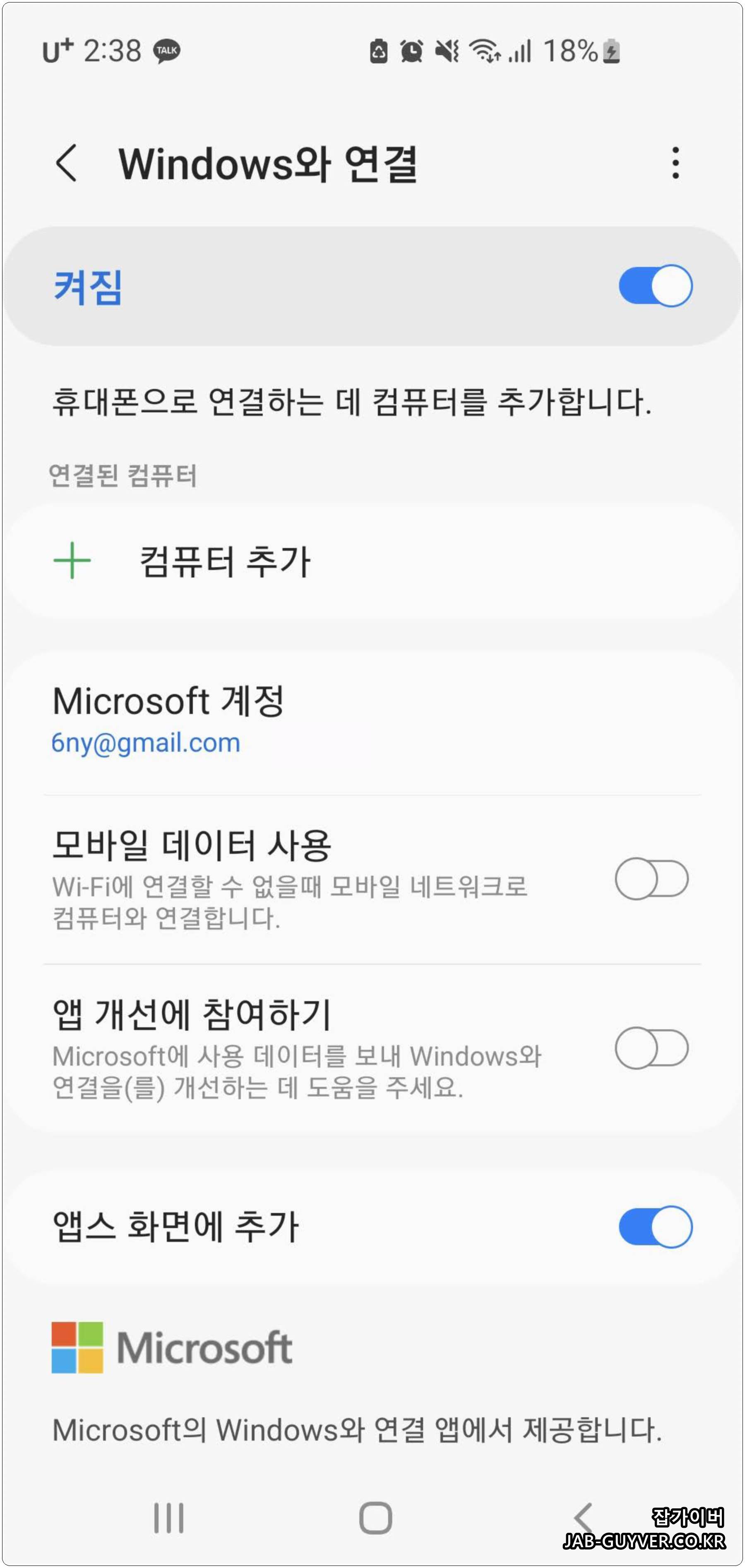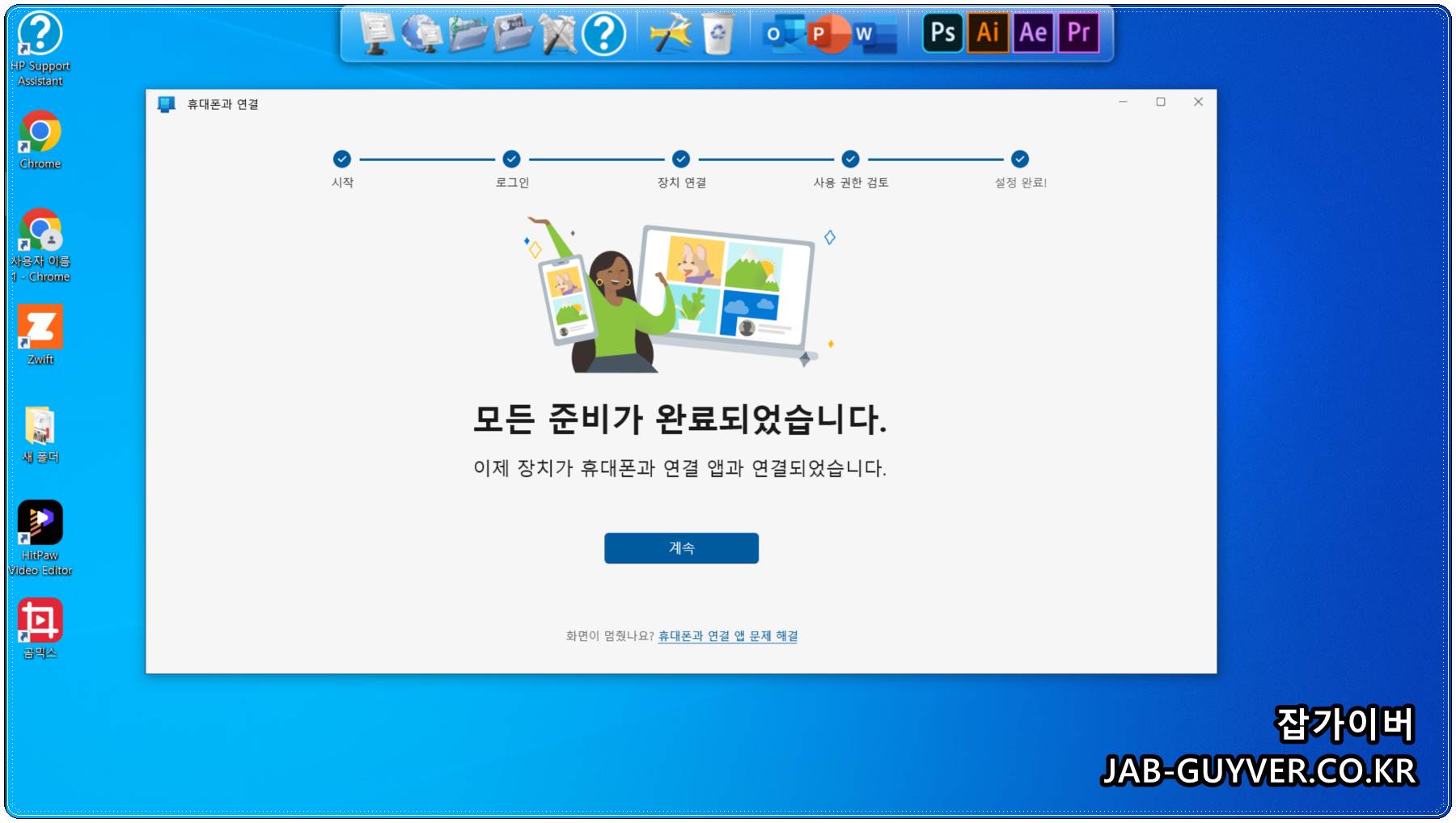 이 상태가 되면 윈도우 노트북과 갤럭시 사이에 양방향 연결이 만들어집니다.
