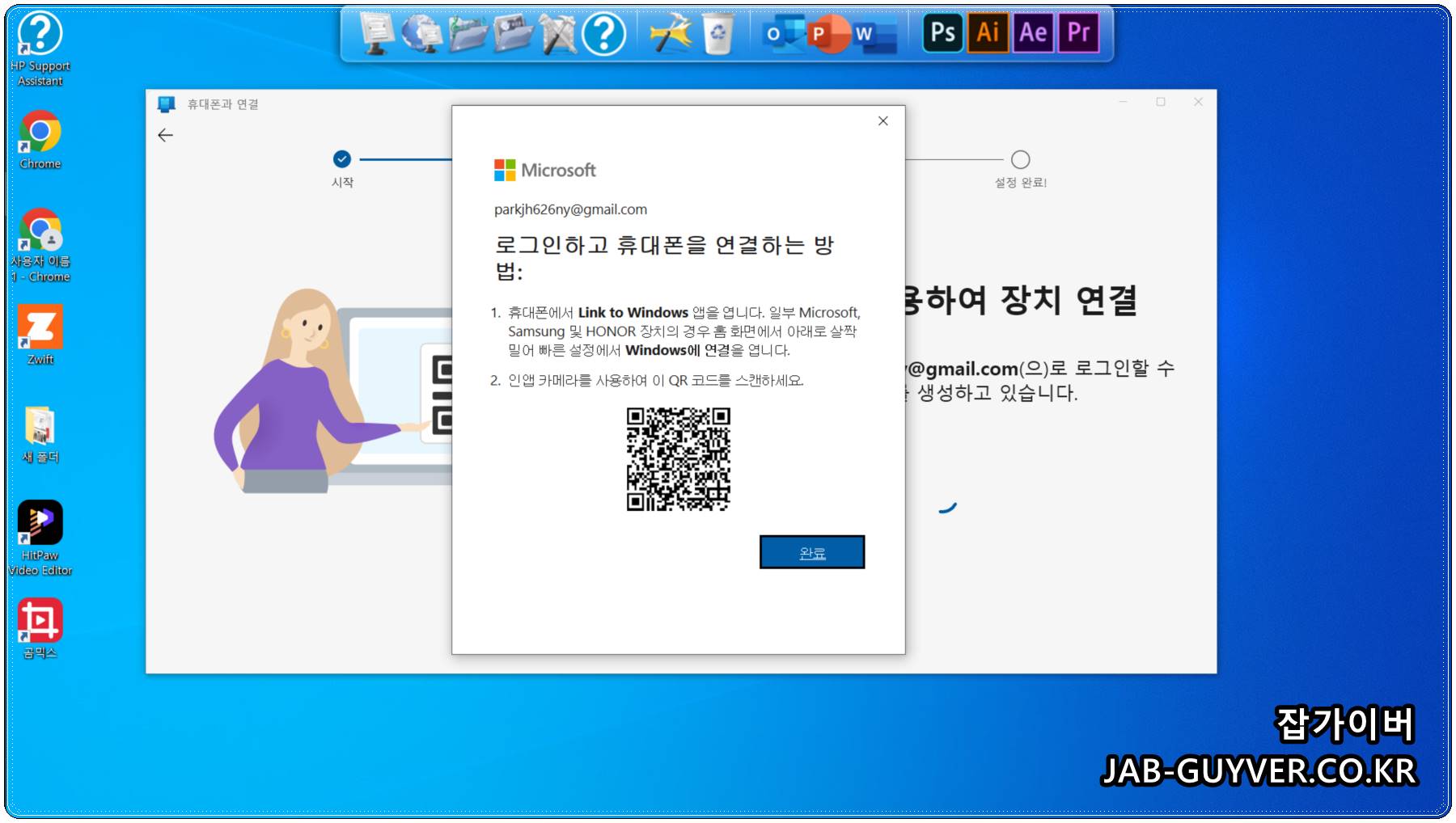 핸드폰 링크 앱에서 표시된 QR코드를 카메라로 스캔하면 연결이 빠릅니다. 마이크로소프트 계정으로 PC·휴대폰 모두 로그인되어 있으면 인증이 한결 수월합니다.