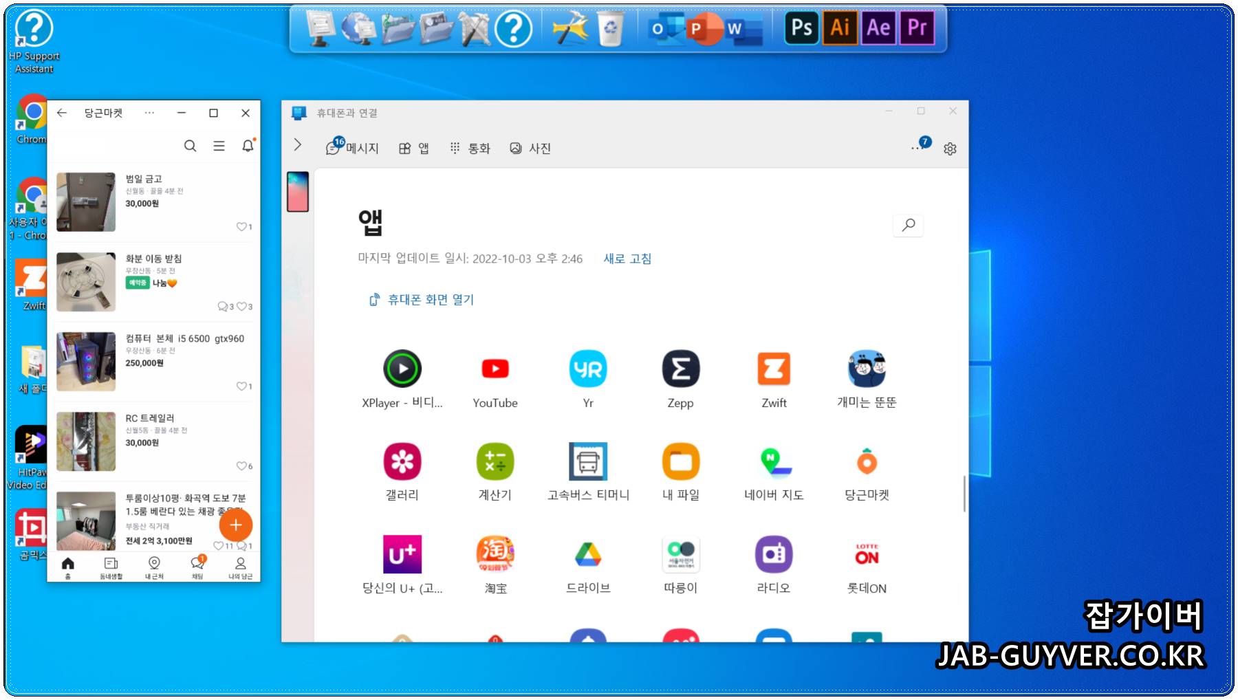 갤럭시 상단바에서 Windows와 연결이 켜져 있다면, PC의 Phone Link 앱에서 카카오톡·유튜브·인스타그램·당근마켓 같은 앱을 눌러 바로 실행할 수 있습니다. 별도의 카카오톡 PC 프로그램을 설치하지 않고 핸드폰 카톡을 노트북 화면에 그대로 띄워 쓰는 느낌입니다.