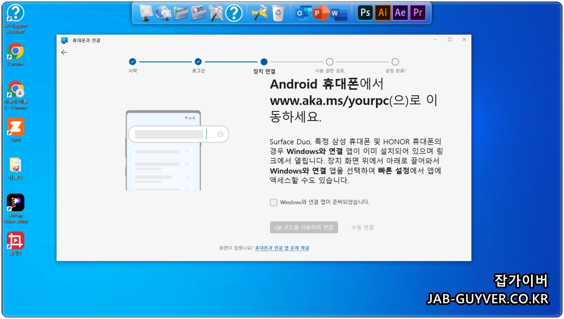갤럭시 화면의 안내에 따라 www.aka.ms/yourpc로 접속하거나,