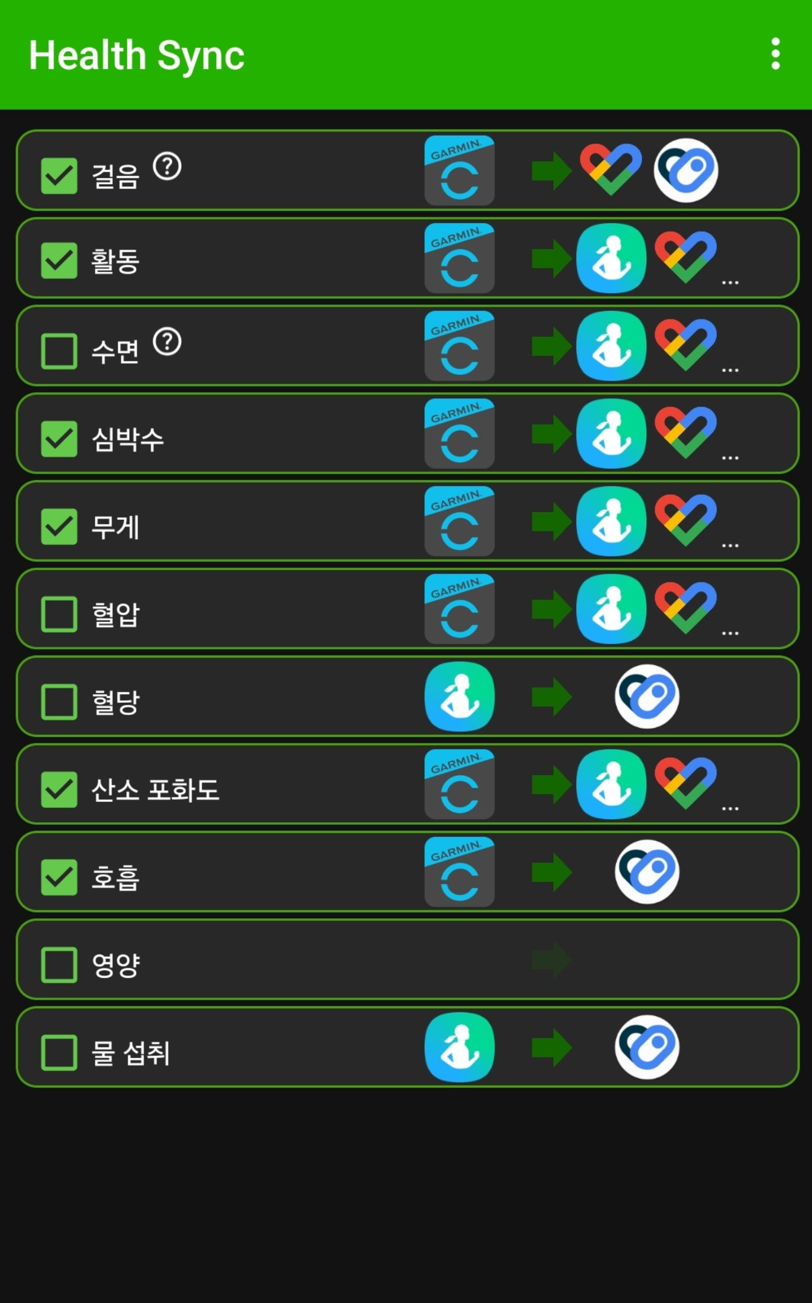 헬스싱크에서 목적지를 삼성헬스(또는 Health Connect를 거치는 구조)로 같이 잡아두면, 가민에서 뛰어도 삼성헬스에 기록이 누적됩니다.