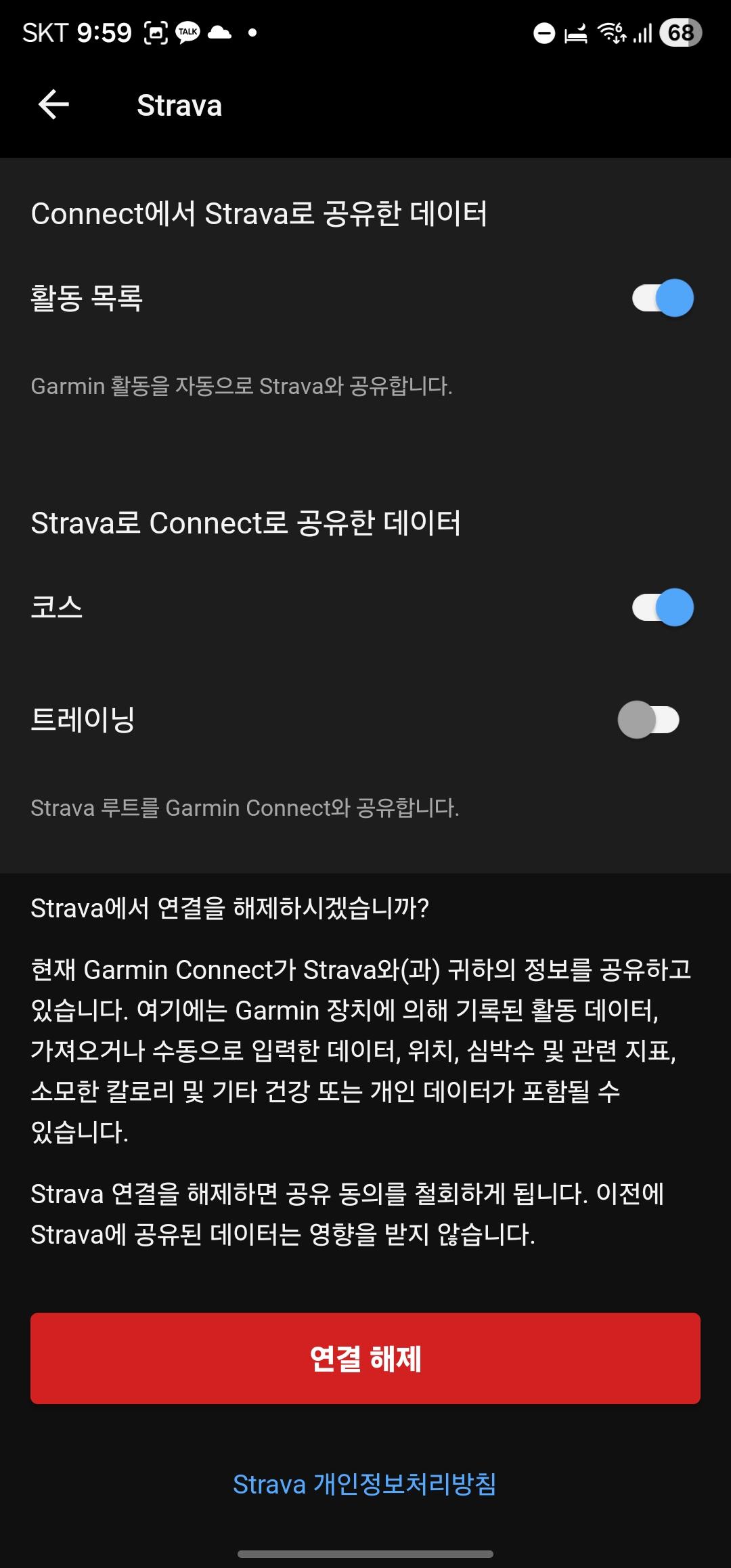 Garmin Connect의 “연결된 앱”에서 Strava가 직접 연결돼 있다면 해제해둡니다.