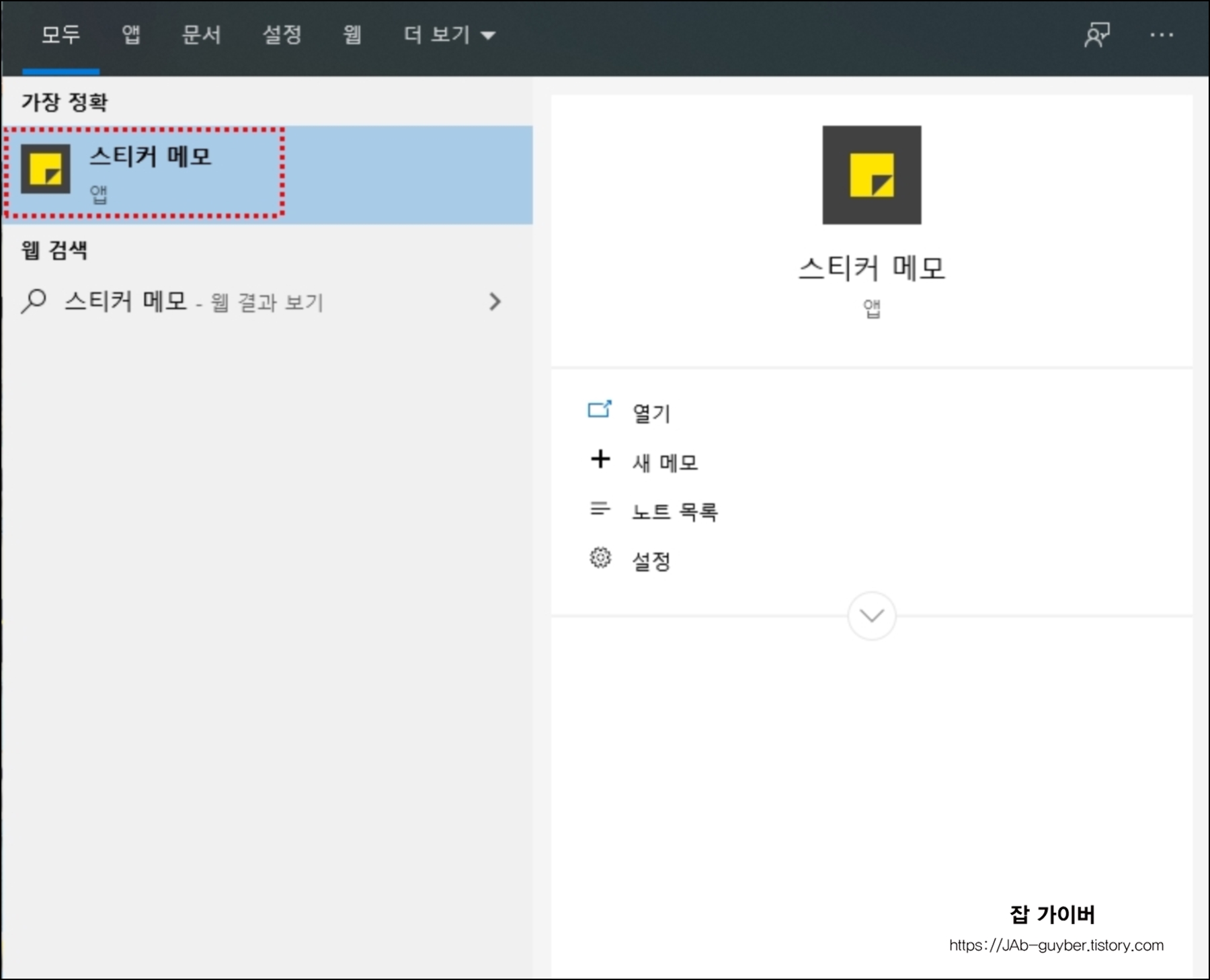 먼저 시작 메뉴 검색창에서 스티커메모를 검색해봅니다. 그래도 안 나오면 Sticky Notes로 한 번 더 찾아보세요. 한글 윈도우에서도 간혹 검색이 영문에 더 잘 반응하는 경우가 있습니다.