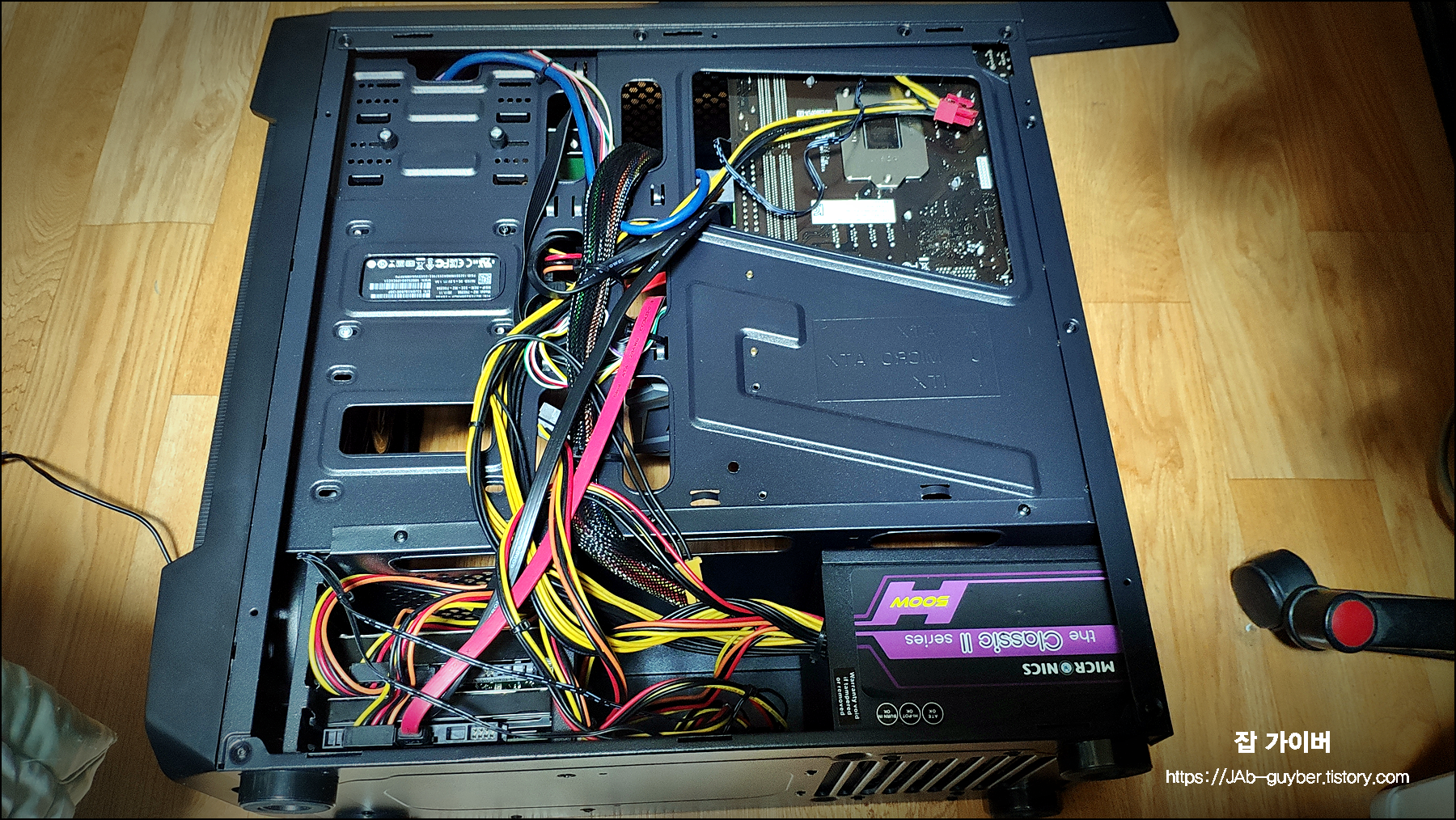 케이스 옆판을 열고, 파워 케이블이 연결된 위치를 전체적으로 사진으로 남겨둡니다.