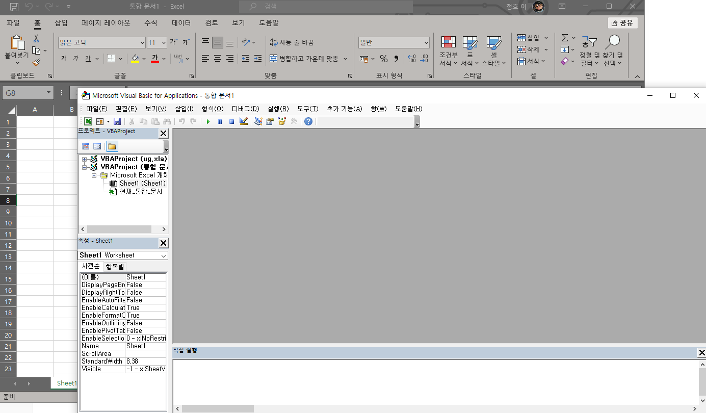 화면을 분할해두면 엑셀 셀과 코드를 번갈아 보면서 작업하기 편합니다. (윈도우 화면 분할은 윈도우키 + 방향키)