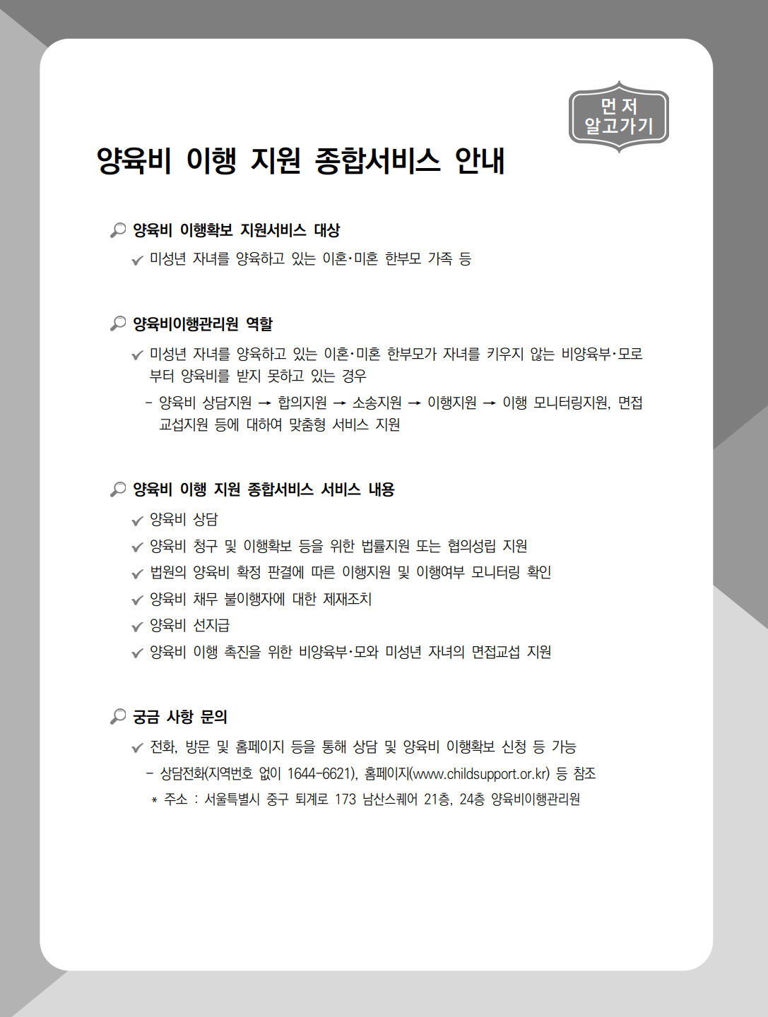 | 양육비 이행지원 | 양육비 청구, 이행확보, 추심 지원 | 법률·행정 지원 | 양육비 미지급 가구 | 양육비이행관리원 이용 |