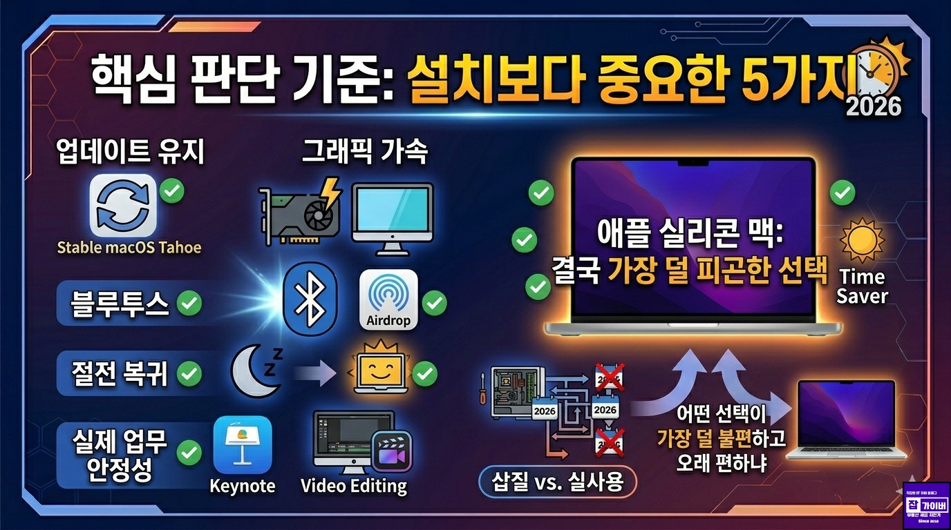 2026년에는 PC에 macOS를 억지로 맞추는 것보다 중고 인텔 맥이나 애플 실리콘 맥으로 가는 쪽이 훨씬 덜 번거롭고 만족도도 높습니다.