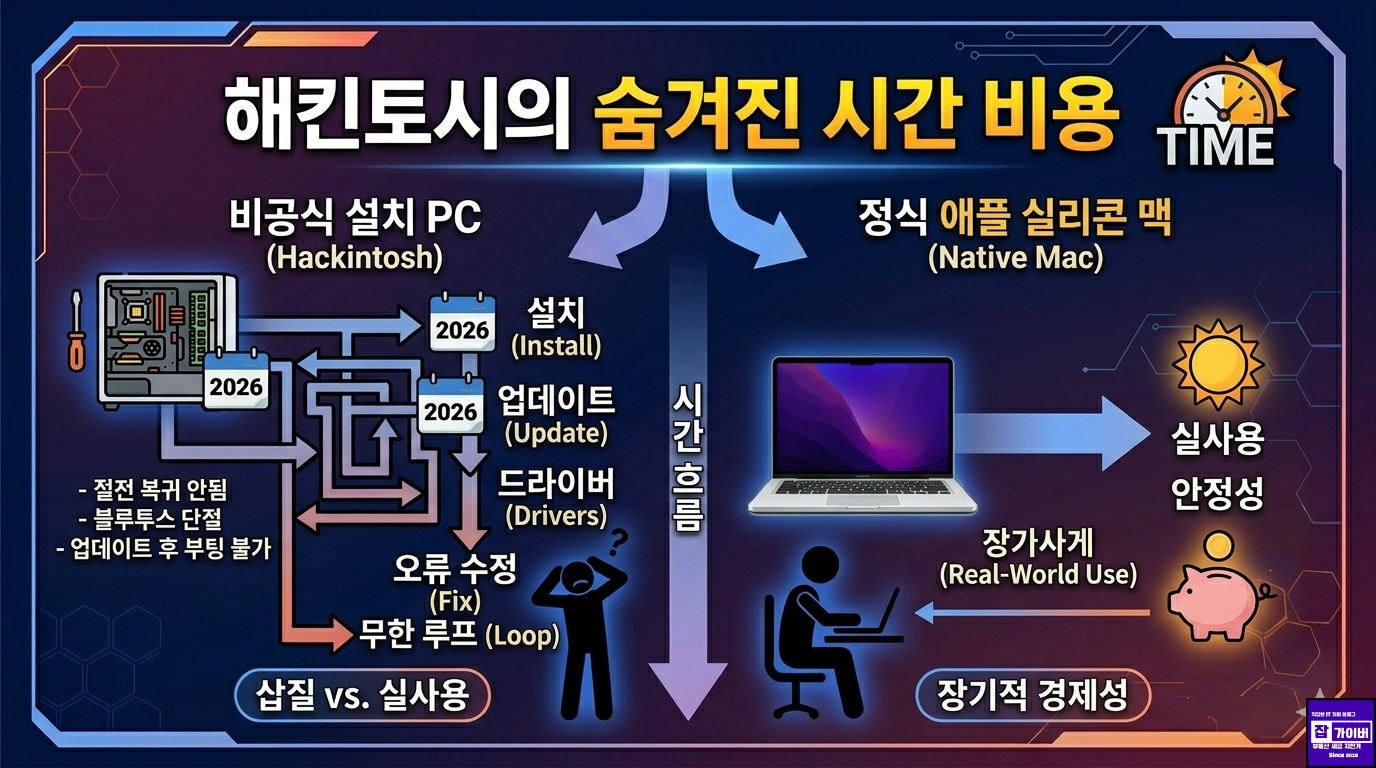 가능하다고 말하는 분도 있지만, 저는 추천하지 않습니다. 일정이 중요한 업무라면 업데이트나 주변기기 문제로 시간을 빼앗길 수 있어서 결국 정식 맥이 훨씬 편합니다.