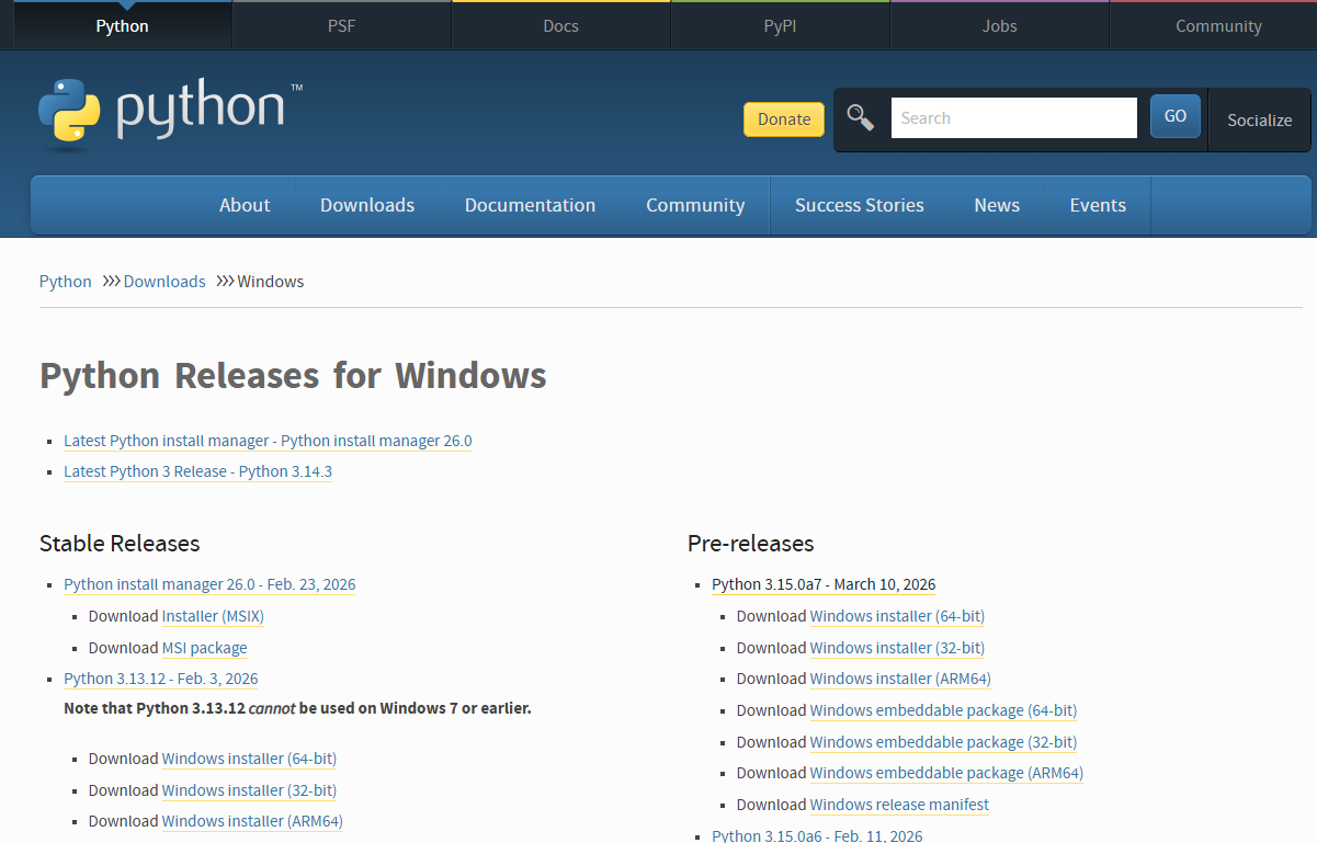 먼저 파이썬부터 설치해야 합니다. 윈도우에서는 공식 다운로드 페이지에서 받는 편이 가장 안전합니다.
