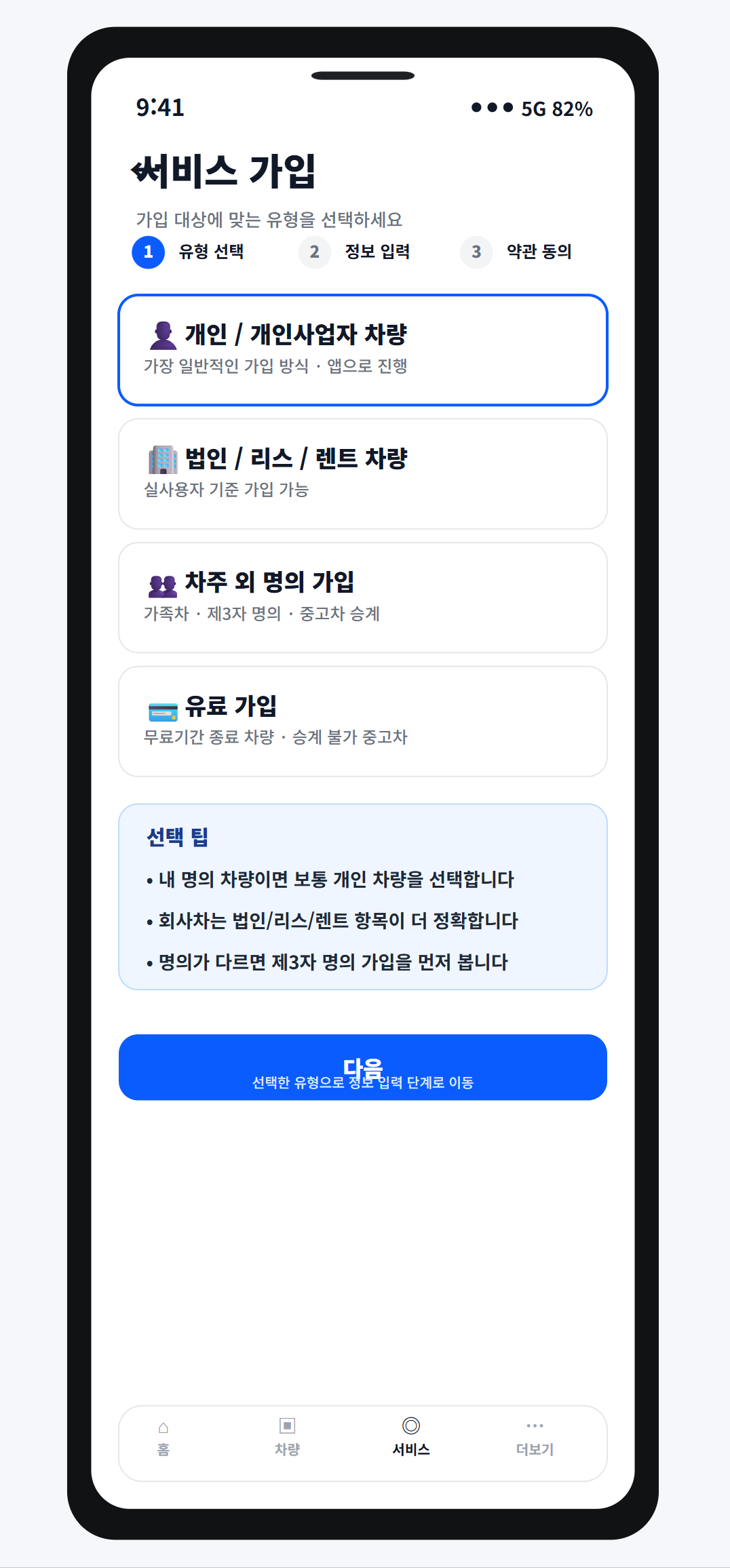 | 개인 차량 | 본인 확인 정보, 차량 정보 | 명의자와 가입자 정보가 다르면 인증 단계에서 막히는 경우가 있습니다. |