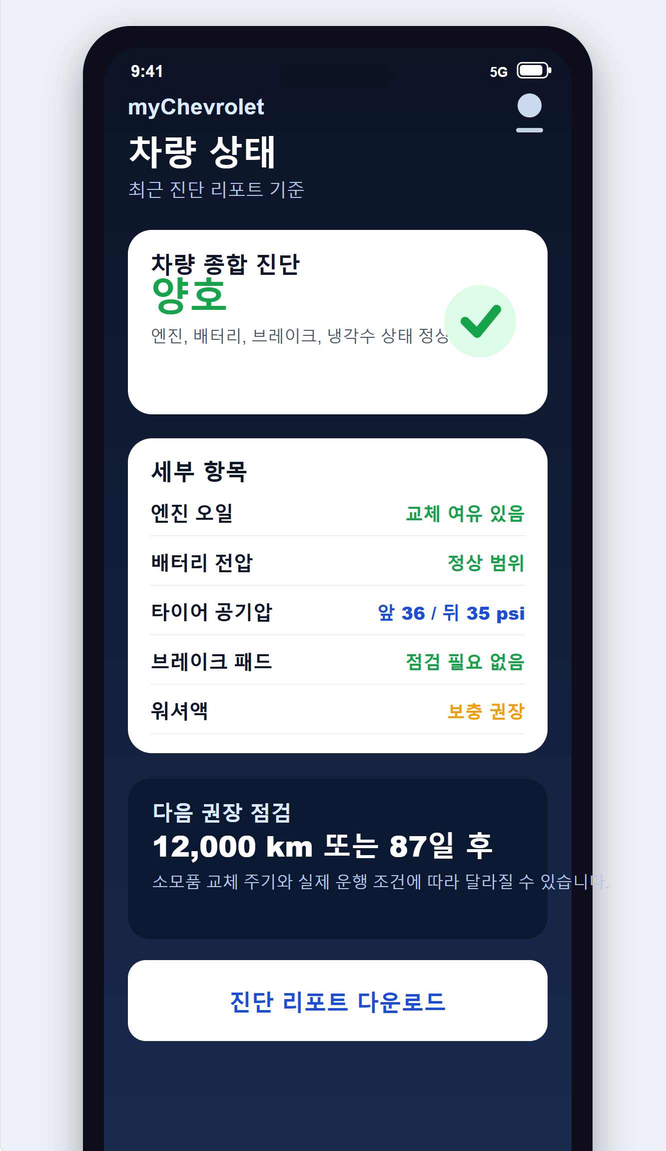 | 차량 진단 | 엔진·변속기, 에어백, 온스타 서비스, 배기 시스템 상태 확인 | 경고등이 뜨기 전 점검 알림을 먼저 보는 용도로 쓰기 좋습니다. |
