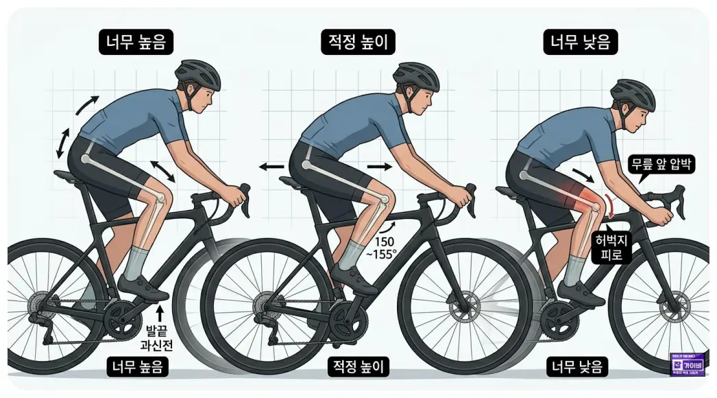 A. 높이만의 문제는 아닙니다. 안장 전후 위치, 각도, 핸들과의 거리, 클릿 위치까지 같이 봐야 더 정확합니다.