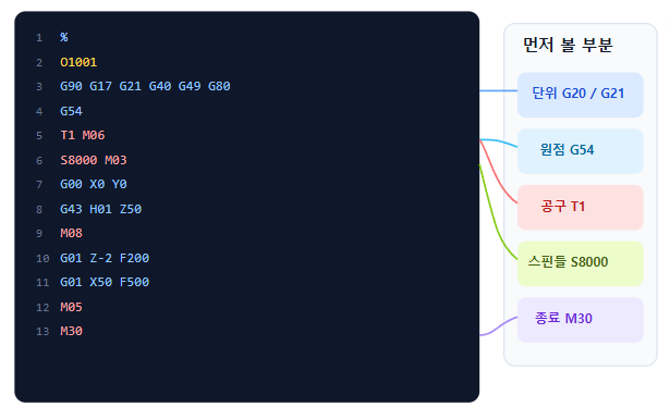| 좌표계 호출 | G54~G59 등 장비 기준에 맞게 출력 | 원점 불일치로 공구가 엉뚱한 위치로 이동 |