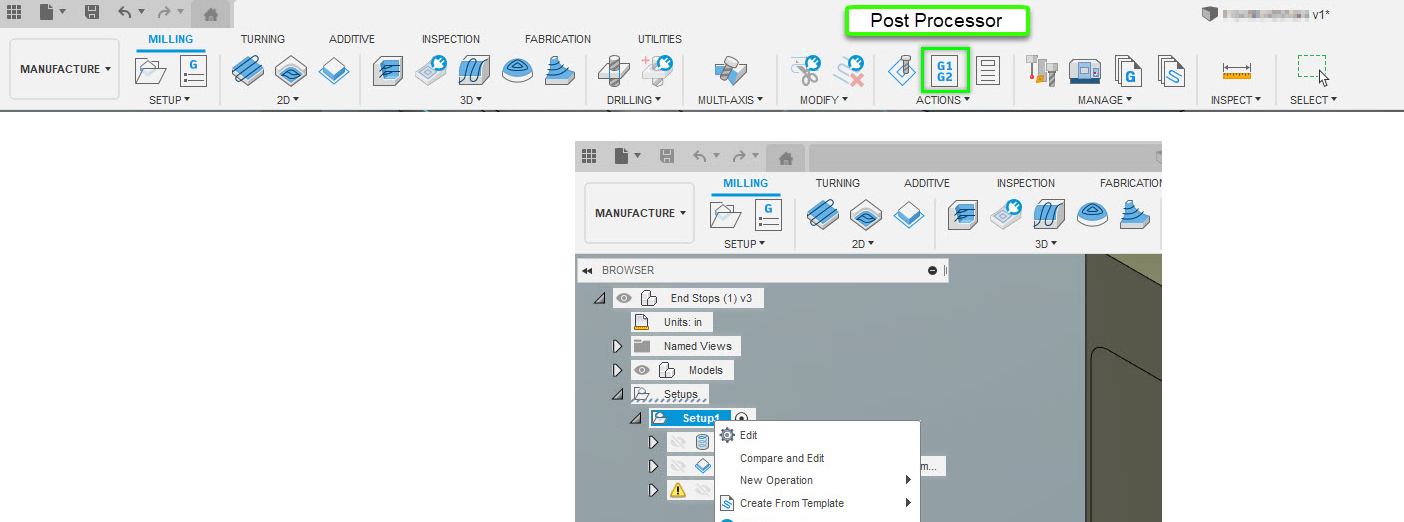 - Manufacture 작업공간 상단 메뉴에서 Actions → Post Process 실행