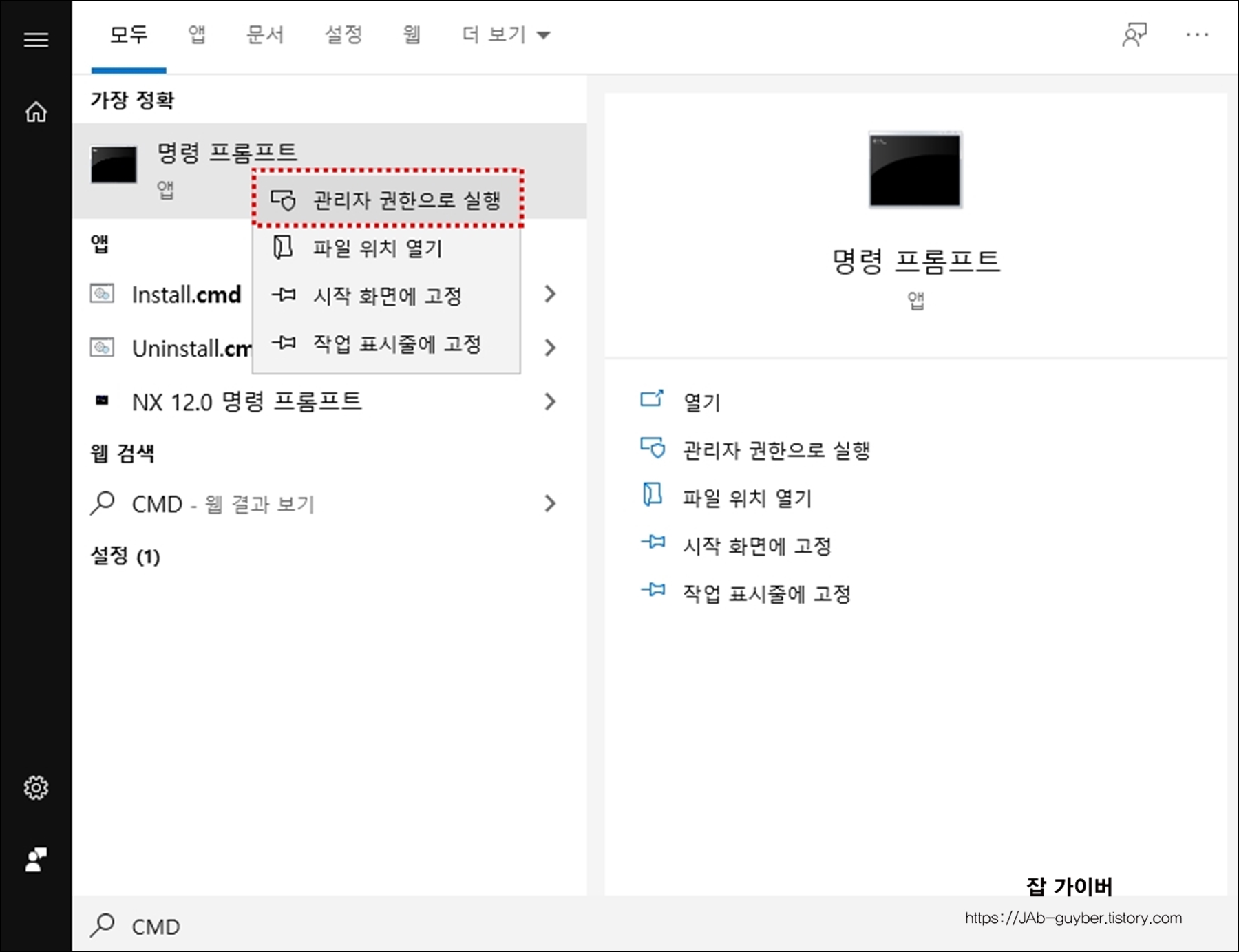 시작 메뉴에서 CMD 또는 명령 프롬프트를 검색한 뒤 아이콘을 마우스 오른쪽 버튼으로 눌러 관리자 권한으로 실행을 선택합니다. 이 권한이 없으면 라이선스 관련 명령이 제대로 적용되지 않습니다.