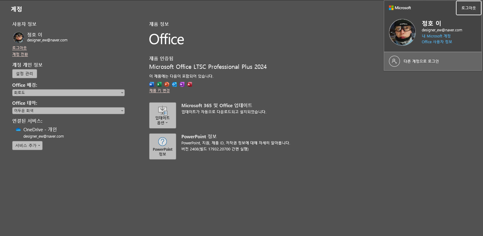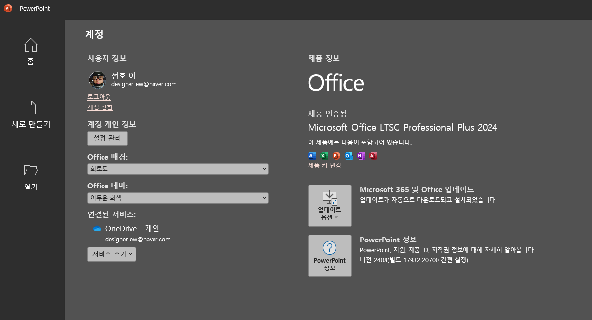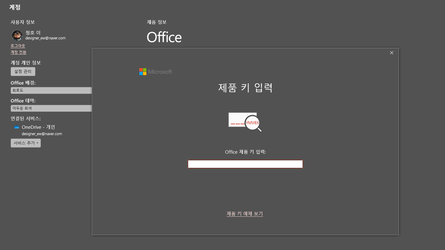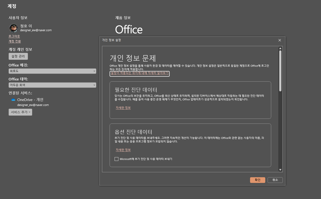그래서 정품을 샀더라도 다른 계정으로 로그인하면 “이 계정에는 오피스 제품이 없습니다” 같은 식으로 보일 수 있습니다.