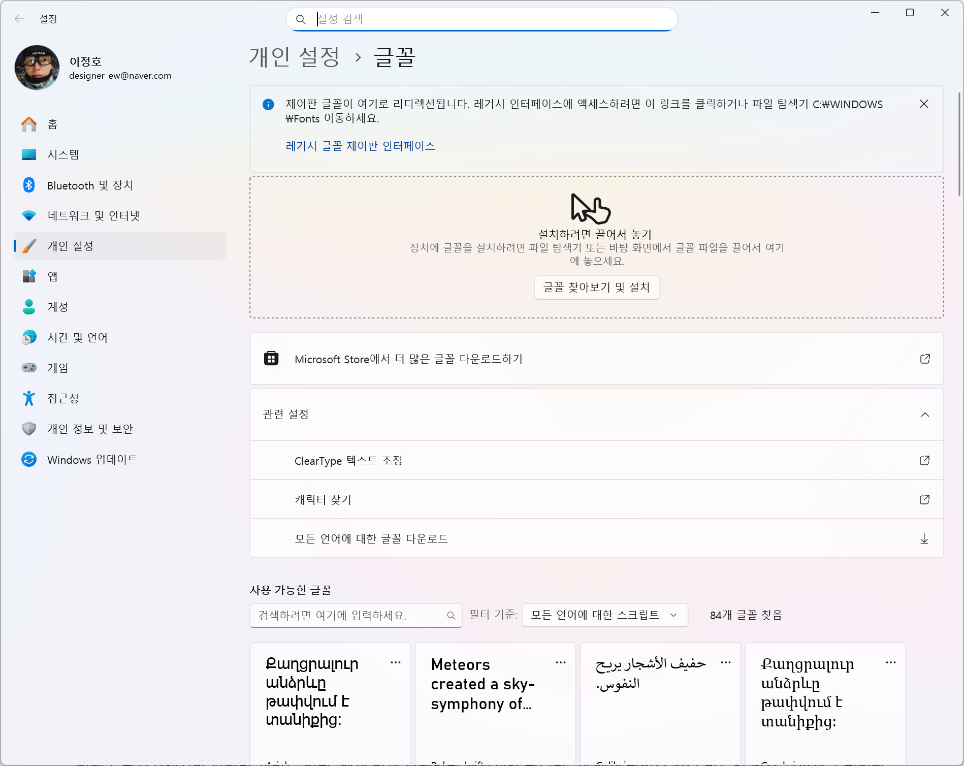- 개인 설정에서 글꼴 메뉴를 확인합니다.