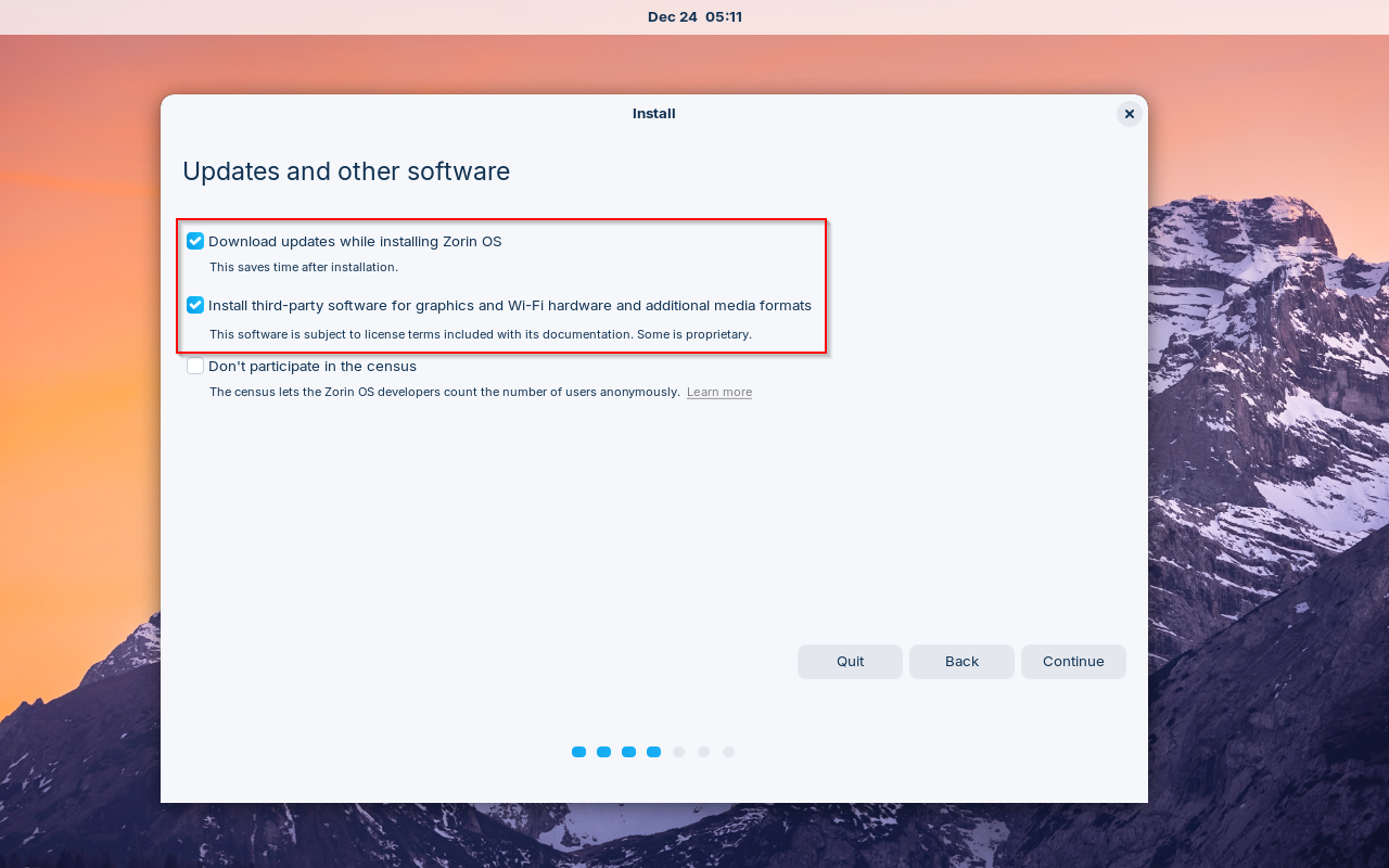 인터넷이 연결돼 있다면 설치 중 업데이트와 서드파티 소프트웨어 설치 항목을 함께 체크할 수 있습니다.