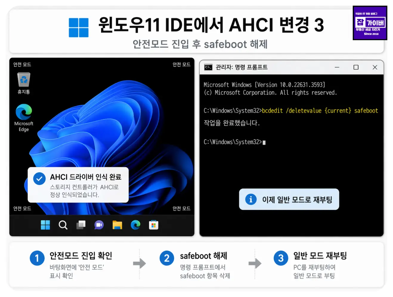 윈도우11에서는 먼저 안전모드로 부팅되도록 설정한 뒤 BIOS에서 SATA 모드를 AHCI로 바꿉니다. 이후 안전모드로 한 번 진입하면 윈도우가 AHCI 컨트롤러를 인식하고, 마지막으로 안전모드 설정을 해제하면 일반 부팅으로 돌아옵니다.