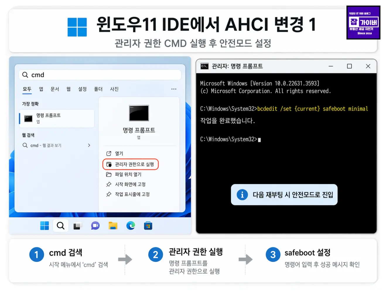 윈도우11에서는 예전 msahci 레지스트리 방식보다 bcdedit 안전모드 설정 → BIOS AHCI 변경 → safeboot 해제 순서가 더 깔끔합니다. 다만 RAID, VMD, Intel RST가 걸린 PC는 저장장치 구조가 다르기 때문에 제조사 설정을 먼저 확인하고 진행하는 것이 안전합니다.