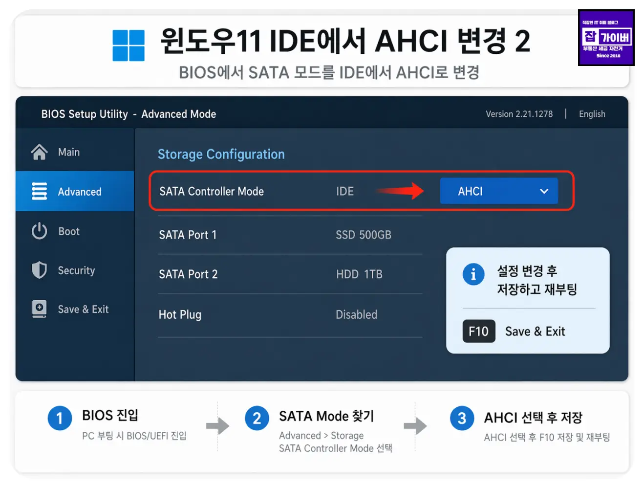 문제는 BIOS에서 IDE를 AHCI로 그냥 바꾸면 윈도우가 바로 부팅되지 않을 수 있다는 점입니다. 기존 윈도우가 IDE 모드 기준으로 설치되어 있는데, 갑자기 저장장치 컨트롤러 모드만 AHCI로 바뀌면 부팅 중 블루스크린, 자동 복구, 무한 재부팅으로 이어질 수 있습니다.