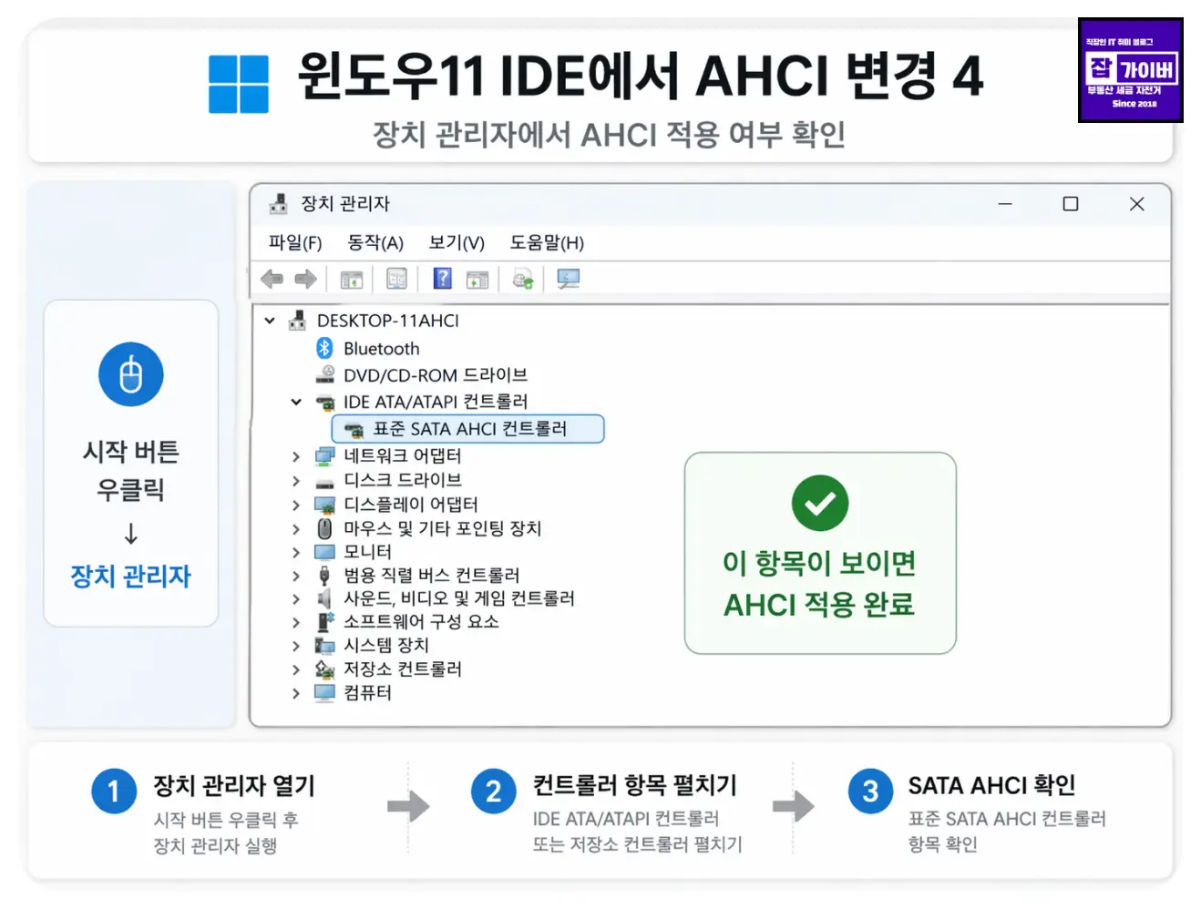 장치 관리자 → IDE ATA/ATAPI 컨트롤러 또는 저장소 컨트롤러 항목을 펼칩니다. 여기에서 표준 SATA AHCI 컨트롤러, Standard SATA AHCI Controller, Intel SATA AHCI Controller 같은 항목이 보이면 AHCI 모드가 적용된 상태입니다.