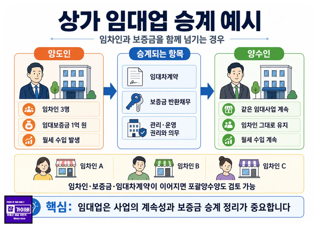 상가 임대업을 예로 들면, 매도인이 임대사업을 하고 있고 매수인이 임차인, 보증금, 임대차계약, 관리 관련 권리와 의무를 넘겨받아 같은 임대사업을 계속한다면 포괄양수양도에 가까워집니다.