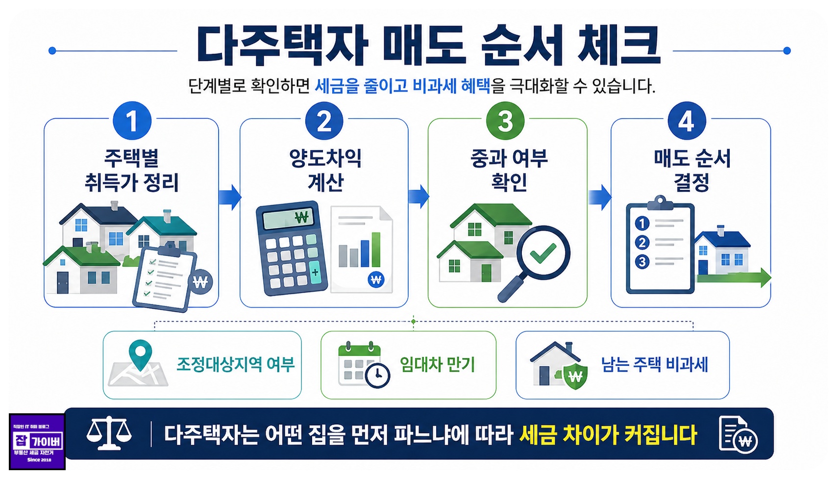 다주택자는 주택별로 양도차익, 보유기간, 조정대상지역 여부, 임대 상태를 나눠 계산해야 합니다. 단순히 가격이 많이 오른 집부터 파는 것이 아니라, 세후 현금흐름이 가장 좋은 선택을 봐야 합니다.