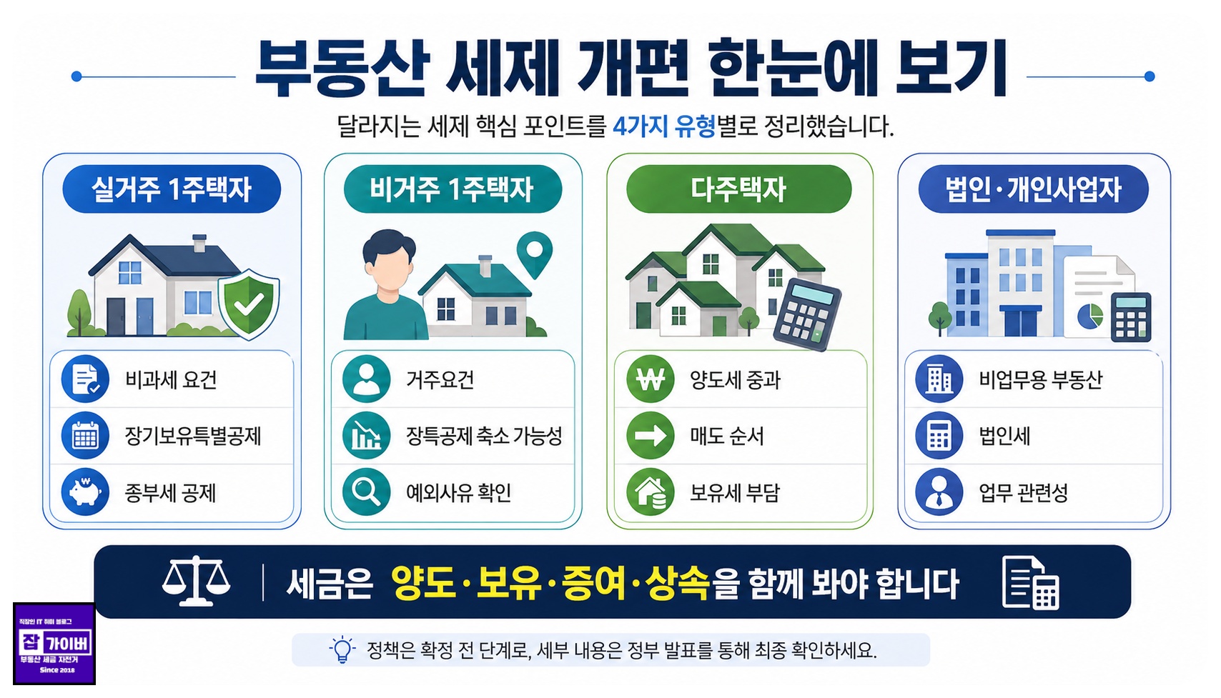 | 장기보유특별공제 | 단순 보유보다 실거주 중심으로 재설계 가능성 | 비거주 1주택자, 고가 1주택자 부담 증가 가능 |
