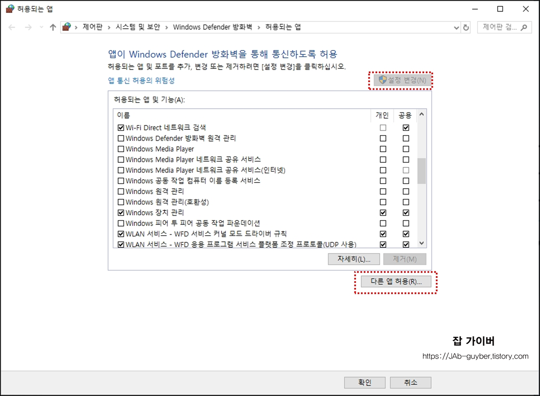 목록에서 예외 처리할 프로그램을 체크합니다. 목록에 없다면 설정 변경을 누른 뒤 다른 앱 허용으로 직접 추가하면 됩니다.