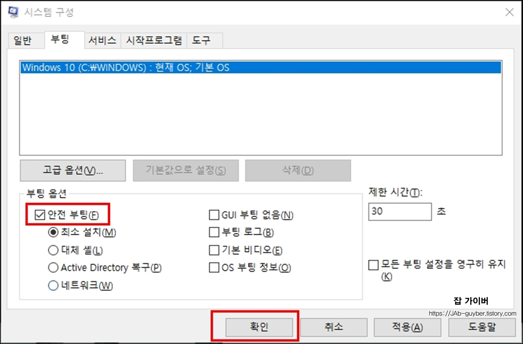 이 옵션을 선택하고 확인을 클릭하면, 다음 번 부팅 시 자동으로 안전모드로 부팅됩니다. 이 방법은 시스템을 정상적으로 부팅할 수 없을 때 매우 유용하게 사용됩니다.